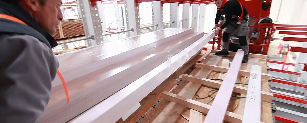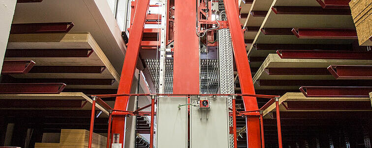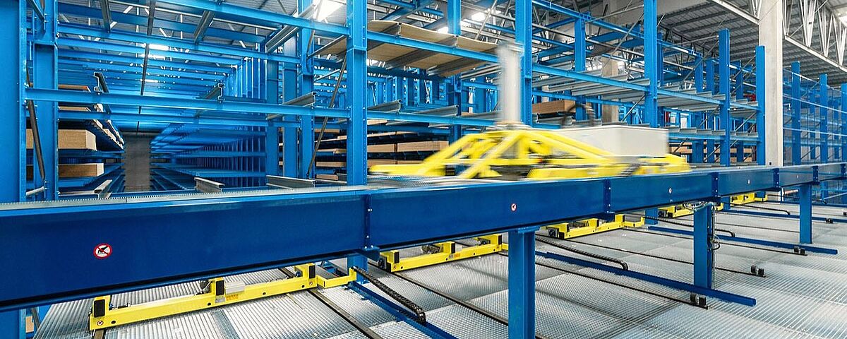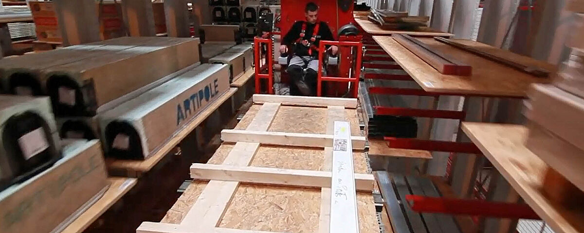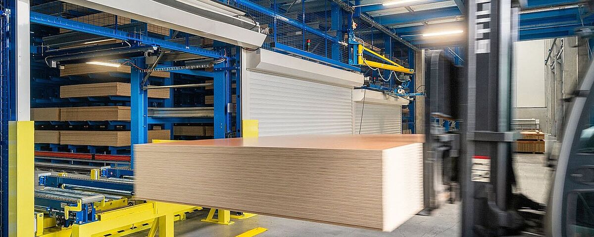 Le concept d'utiliser les avantages de la préparation de commandes en deux étapes est totalement nouveau : Le stockage et le déstockage des colis dans l'entrepôt sont assurés par un transstockeur (SRM). Si une commande d'expédition nécessite le prélèvement de différents panneaux individuels, un manipulateur pneumatique prépare les articles correspondants pour l'expédition, ce qui permet de traiter plusieurs commandes en parallèle.