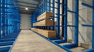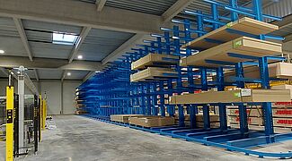 Le groupe Derrey, négoce en matériaux de construction a équipé sa nouvelle agence « Gedibois Derrey » à Metz de rayonnages cantilever OHRA. Grâce à des solutions spéciales, les rayonnages s'adaptent parfaitement aux différentes gammes de produits et aux contraintes du bâtiment. Pour se faire, des rayonnages asymétriques ont été utilisés : Il s'agit de rayonnages double face dont les bras de gauche et de droite se différencient par leur capacité de charge et leur longueur. Il est ainsi possible de stocker de manière efficace et peu encombrante, de nombreux bois et panneaux aux dimensions différentes. Une partie des rayonnages se trouve dans un hall ouvert, de ce fait, les premières colonnes et bras d'une rangée peuvent être exposés aux intempéries. C'est pour cette raison qu'OHRA a galvanisé à chaud ces parties du rayonnage, tandis que les autres éléments ont été revêtus d'une peinture en poudre.