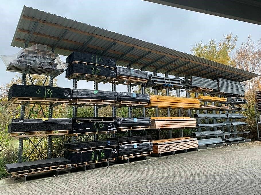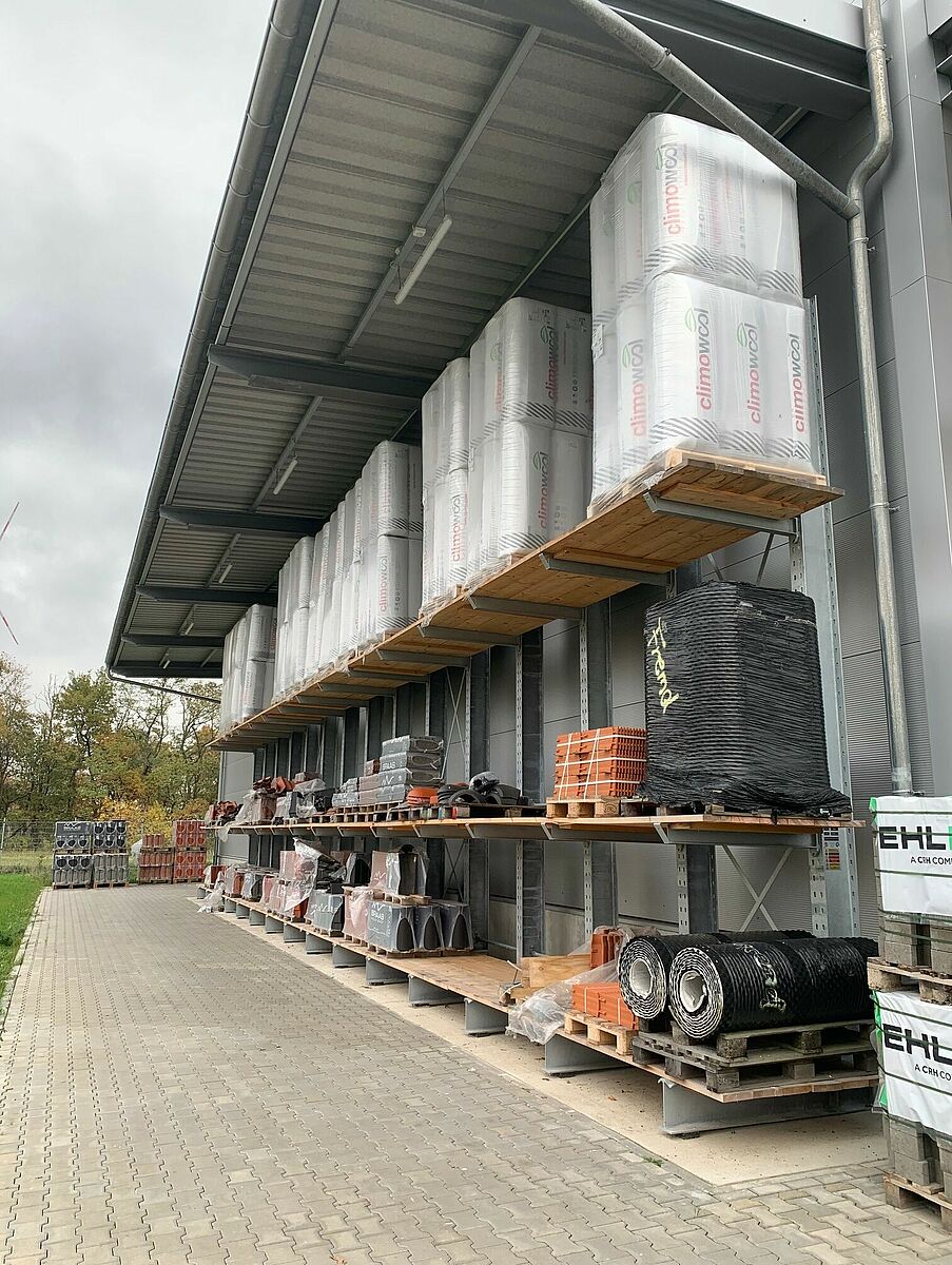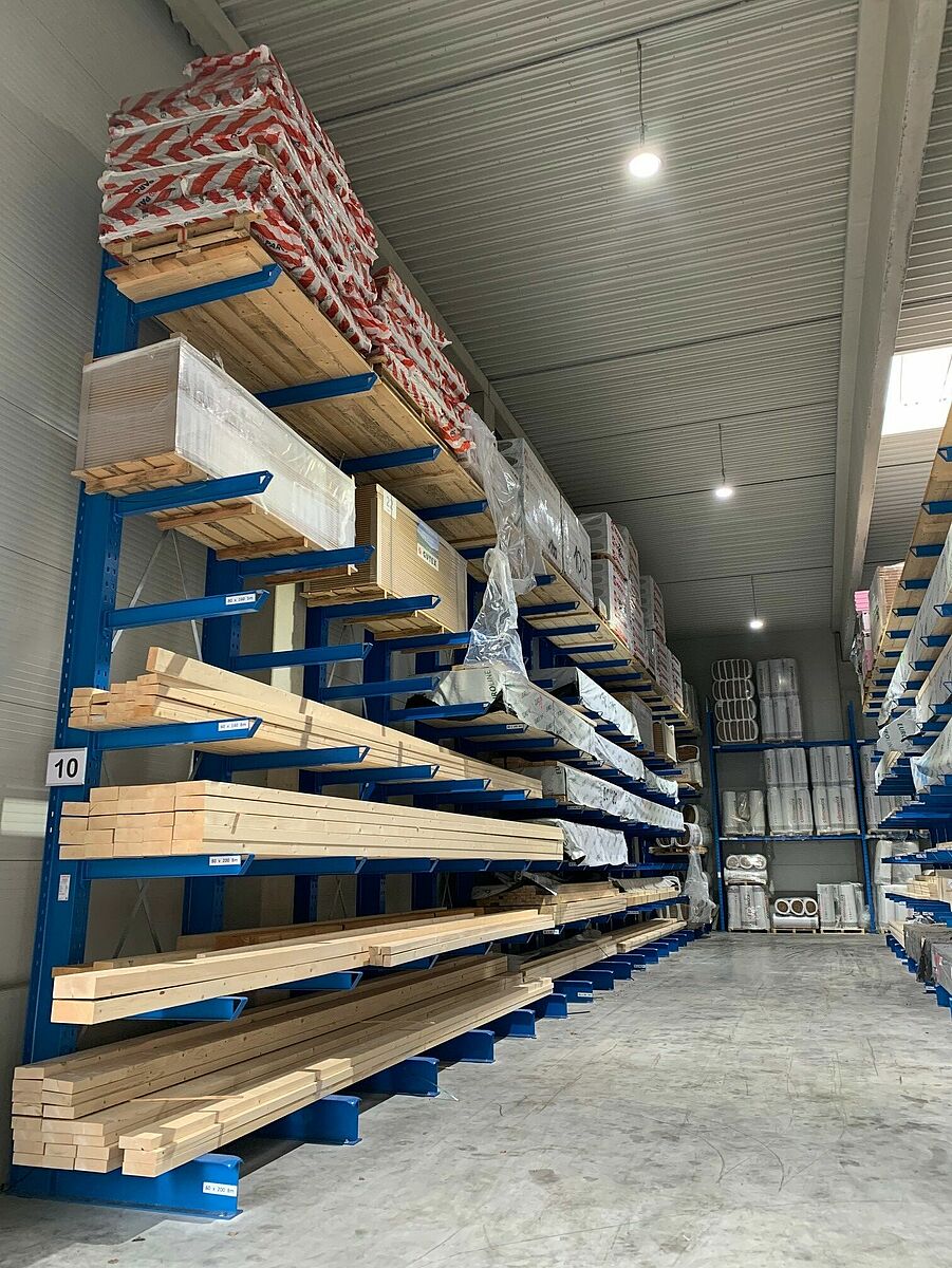Le nouvel entrepôt de 12 mètres de haut a été construit sur une surface de 1 000 mètres carrés et offre un espace supplémentaire pour les nouveaux articles tels que les panneaux de façade, les panneaux isolants ou le bois massif de construction. Beaucoup d'articles désormais rangés confortablement et en toute sécurité sur des étagères étaient auparavant stockés à l'extérieur et à même le sol. Les rayonnages à palettes, d'une hauteur de 6,58 mètres, et les rayonnages à bras portants, d'une hauteur d'environ 7 mètres, ont permis à la fois d'augmenter la capacité de stockage et d'améliorer sensiblement l'accès aux articles. Au total, OHRA a installé quatre rangées de rayonnages - chacune mesurant environ 18 mètres de long - lesquelles sont constituées de rayonnages à bras portants et à palettes, y compris deux rangées de rayonnage à bras portant de 25,5 m de long avec six niveaux de stockage le long des murs intérieurs de l’entrepôt. D'autres rayonnages à bras portants, érigés à l’extérieur, offrent de l'espace pour des matériaux de construction moins sensibles.