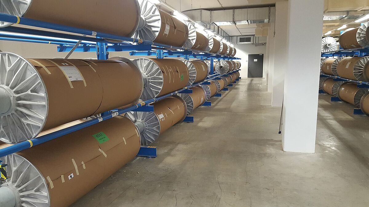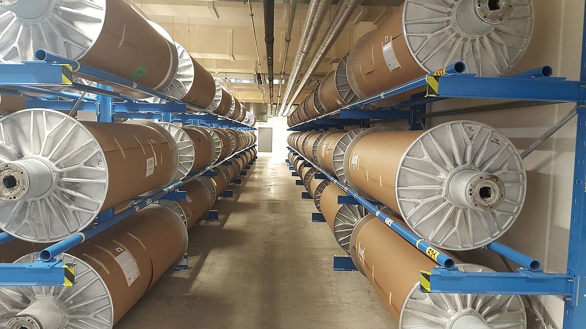 Au total, OHRA a livré et assemblé jusqu'à présent trois rayonnages cantilever sur lesquels les ensouples peuvent être stockées sur trois niveaux. Les supports d'étagères - avec entre 2,3 et 2,9 mètres de haut - ont été adaptés à la hauteur de la pièce au sous-sol afin que l'espace soit utilisé de manière optimale. L'extension du magasin avec d'autres rayonnages cantilever d’OHRA est déjà en cours de gestation.