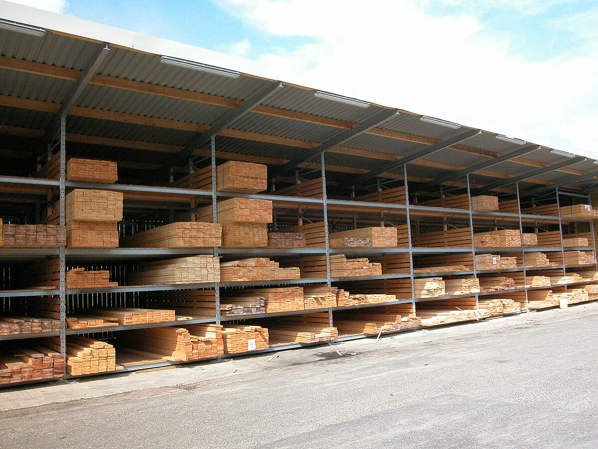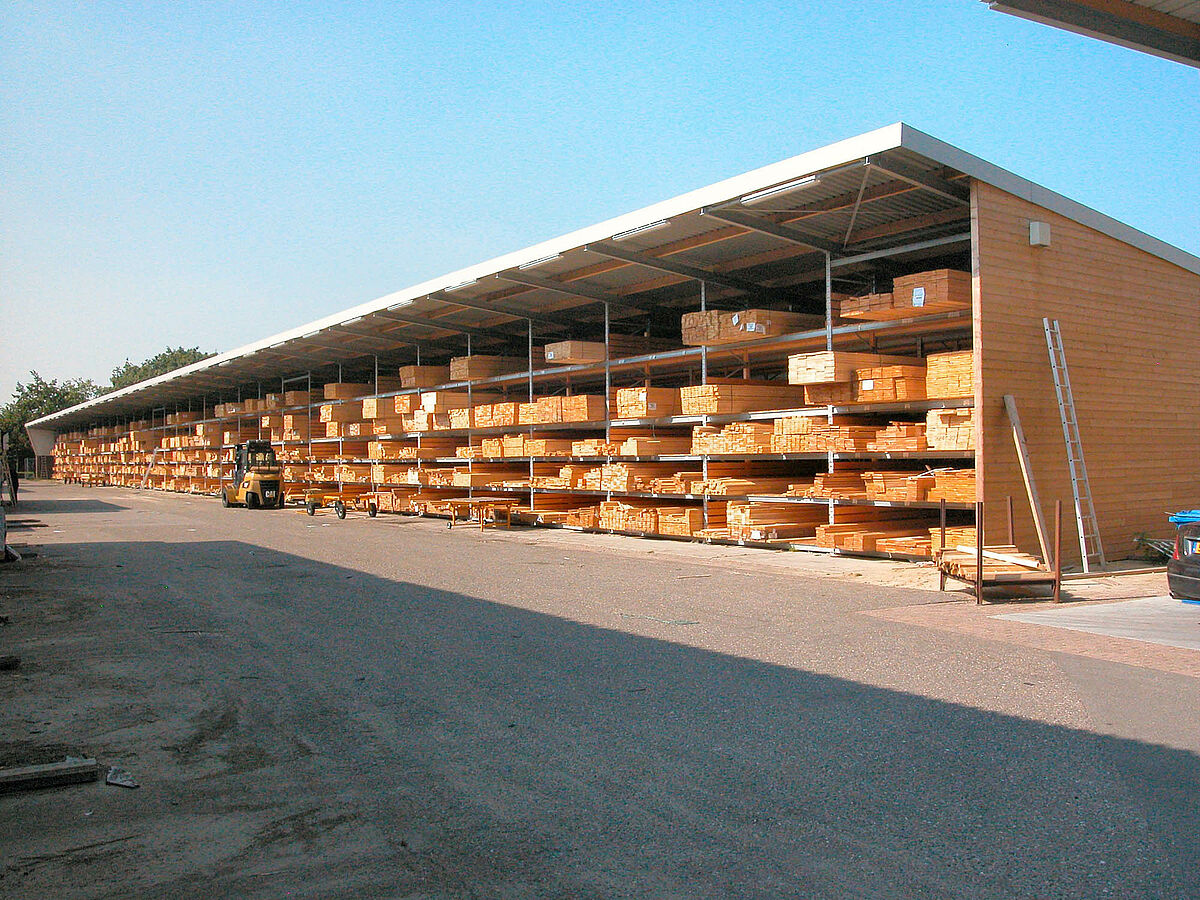 La réalisation de ce nouvel entrepôt fut confiée à OHRA. Cette entreprise établie à Kerpen, en Allemagne, est spécialisée dans les solutions de rayonnages destinées au commerce des matériaux de constructions et du bois. Chez Gooskens, OHRA a utilisé le système de rayonnages à palettes. Pour obtenir la profondeur de stockage nécessaire, les experts OHRA ont disposé plusieurs supports de rayonnage les uns derrière les autres puis les ont pourvus d'un plancher. Les supports sont en profilés d’acier laminé à chaud et, en cas de collision, fléchissent élastiquement et conservent leur haute résistance verticale. La toiture de la construction protège le bois stocké des intempéries et fait de l'entrepôt un bâtiment autonome. Le nouvel entrepôt est haut de 6 m et s'étend sur 120 m. Les cinq niveaux de stockage sont dotés d'une capacité portante de 2 800 kg.