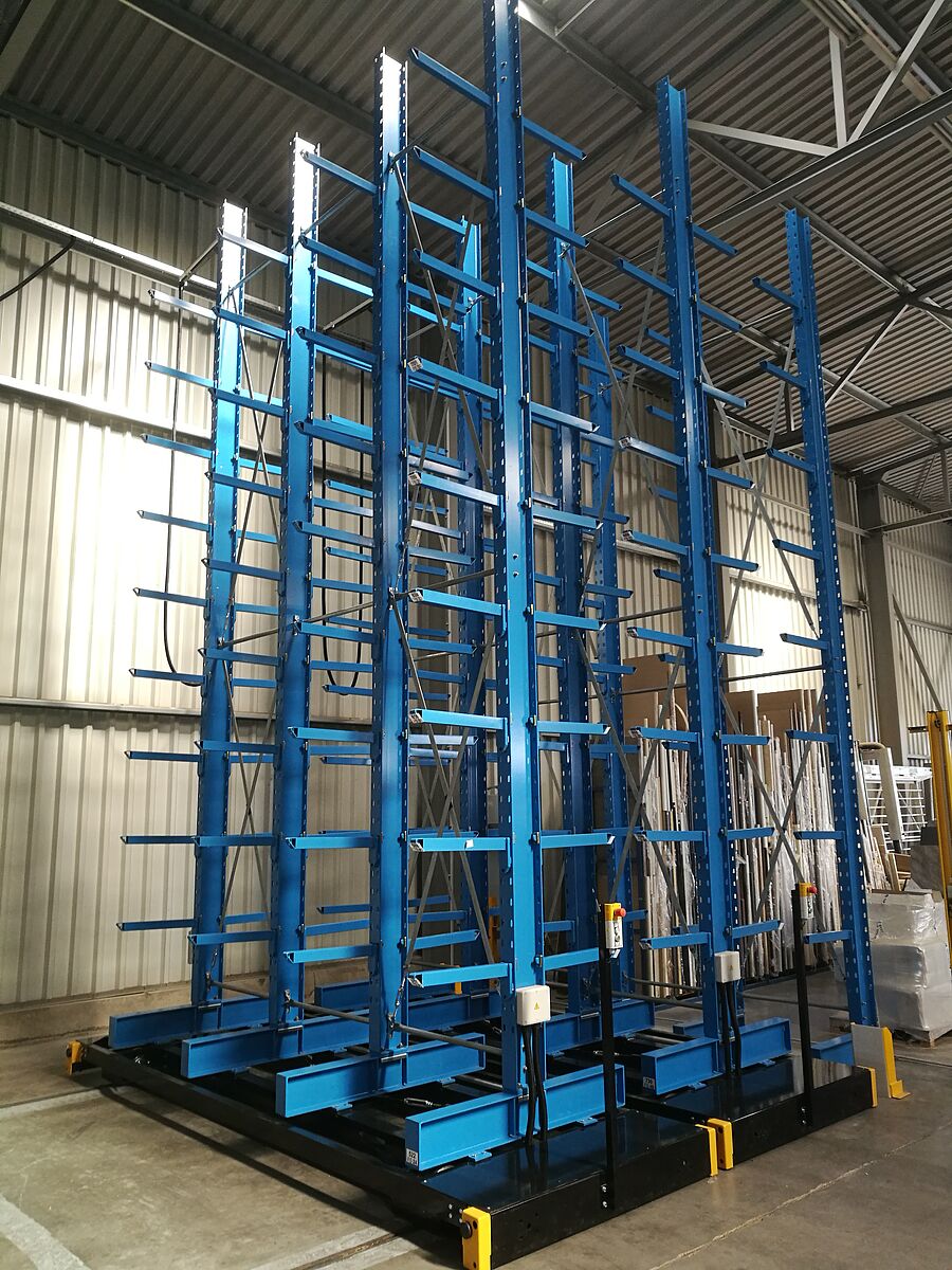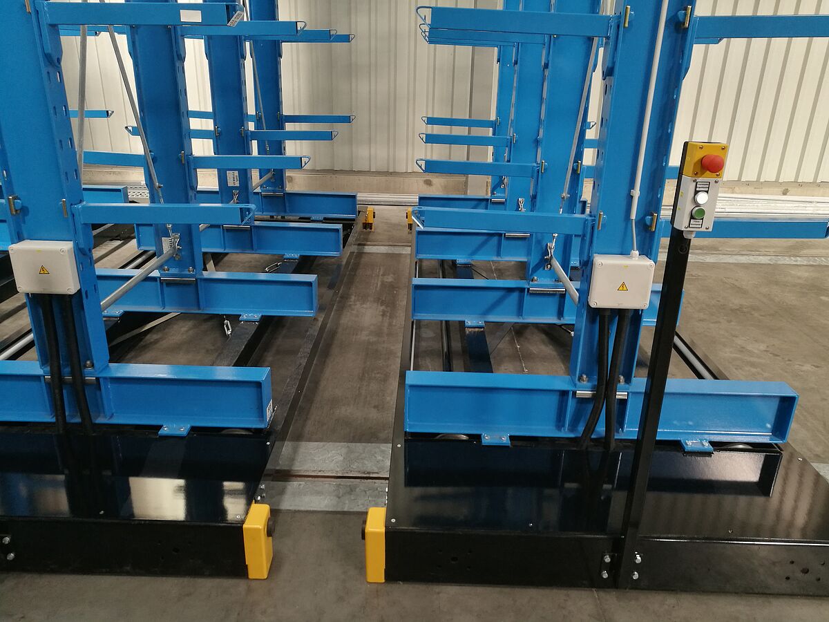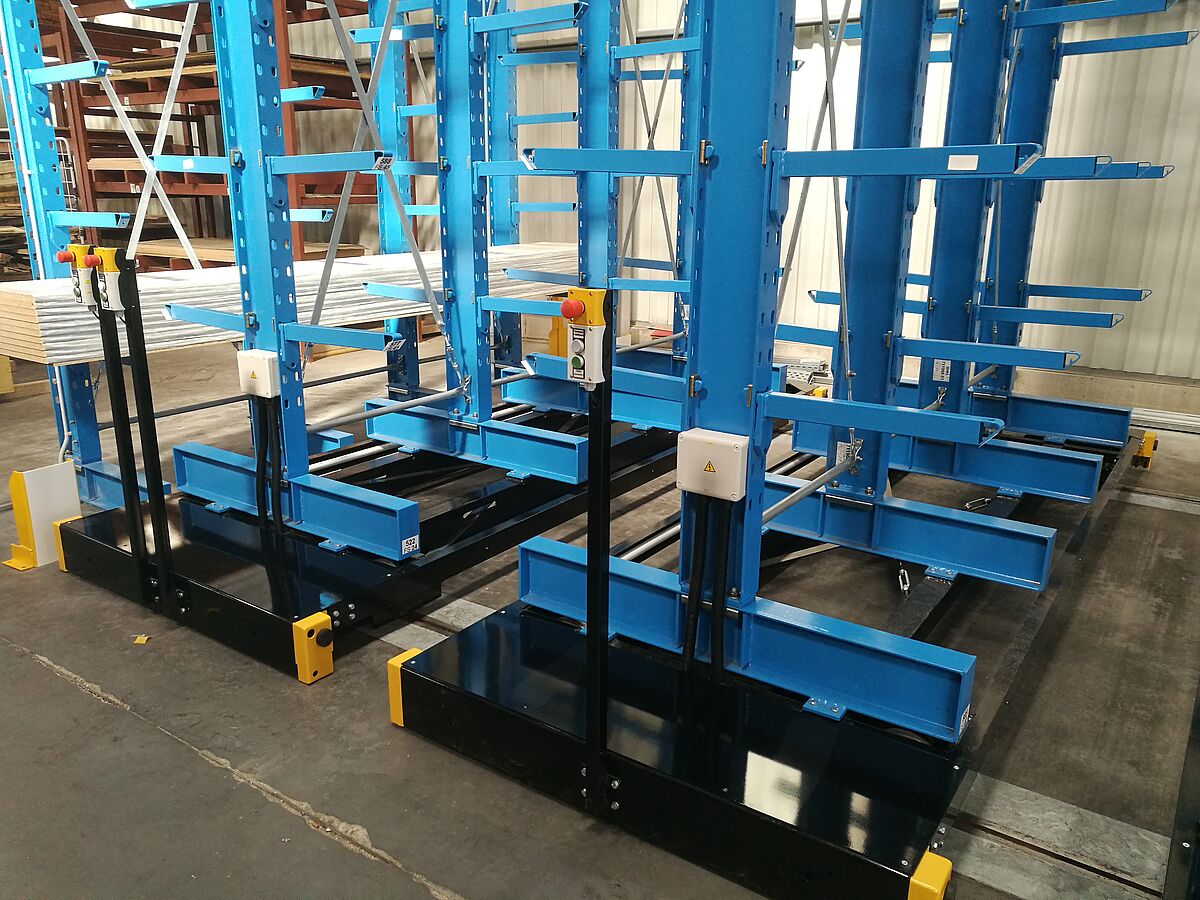 Le nouvel entrepôt pour plans de travail de cuisine se compose au total de sept rangées de rayonnages. Chaque rangée a une hauteur de 6600 millimètres, une longueur de 3300 millimètres et se compose de quatre colonnes chacune, sur lesquels neuf bras cantilever sont suspendus de manière flexible. Il en résulte un total de dix niveaux de stockage : le niveau le plus bas se trouve sur les socles. Les rangées extérieures ne sont accessibles que d'un côté et fixées au sol, les autres rangées sont montées sur des basses mobile qui se déplacent sur des rails posés au sol. Pour cela, les bases mobiles doivent être côte à côte avec les rayonnages qui sont montés dessus. En cas de besoin de marchandises sur un rayonnage, les bases mobiles motorisées s'écartent et ouvrent l’allée souhaitée. La commande se fait depuis le chariot élévateur à distance ; une commande manuelle est également possible. Avec un système exceptionnel, la meilleure exploitation des espaces est possible, et presque 100 pour cent de capacité de stockage supplémentaire peut être gagnée par rapport aux rayonnages « rigides » ordinaires.