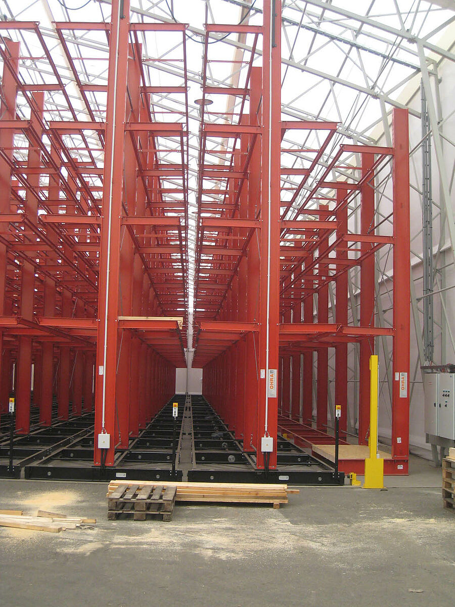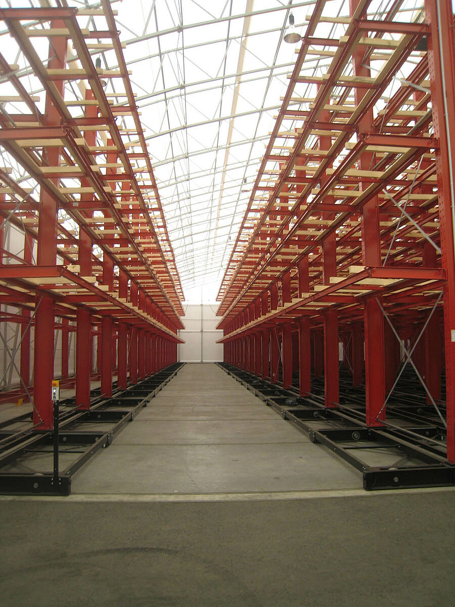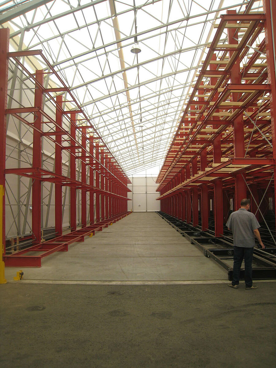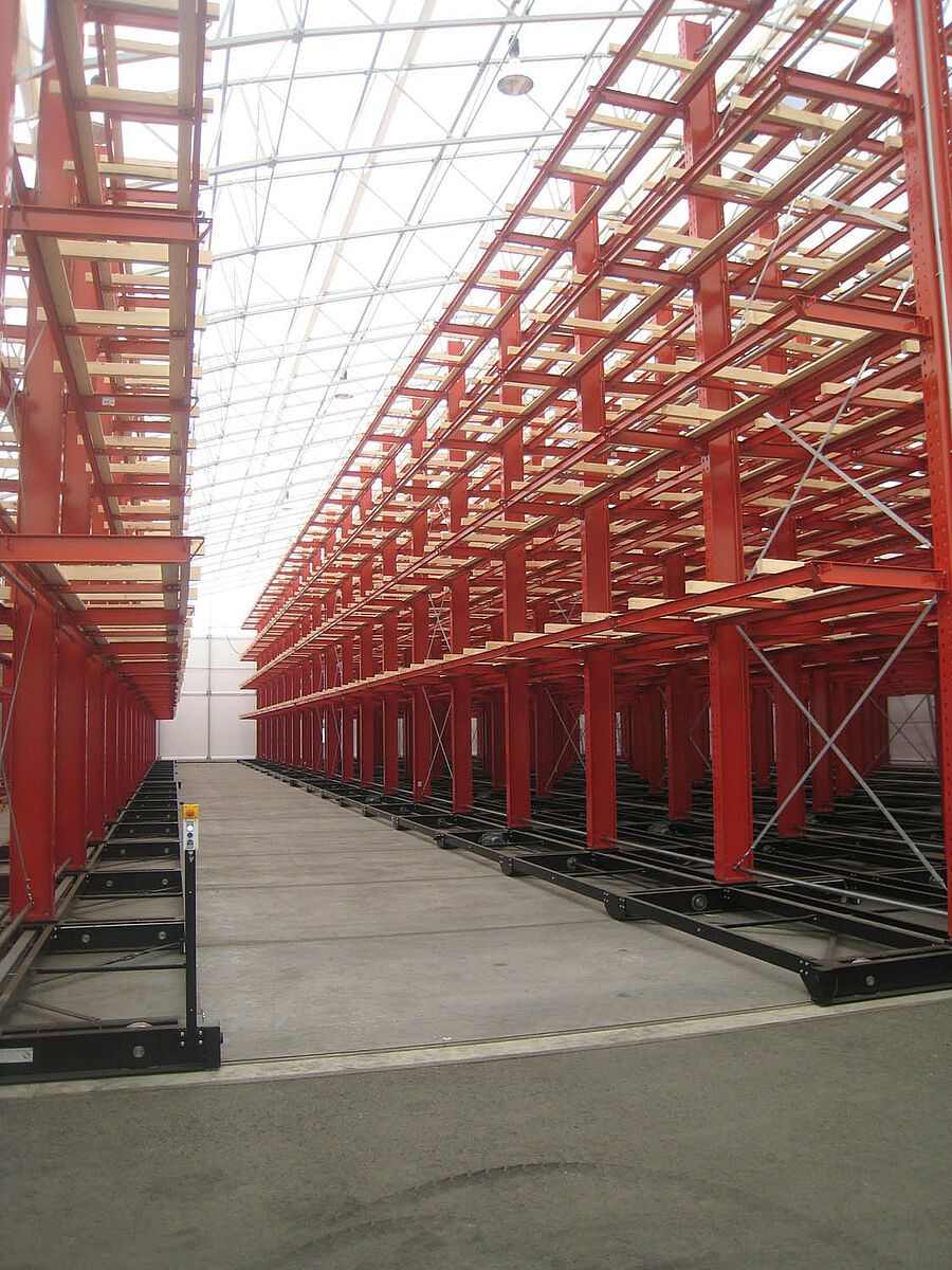 OHRA s'est chargée de l'organisation du système de rayonnages complet. Cela comprenait également l'installation des rails nécessaires aux supports mobiles, qui eut lieu avant la construction du hall extérieur proprement dit. Deux des dix rayonnages à bras portants de 60 m de long, constitués de 4 à 5 niveaux allant jusqu'à 9,2 m de hauteur, ont été fermement vissés au sol. Les huit autres ont été montés par OHRA sur des supports mobiles de 58 m de long. Les supports mobiles sont entraînés électriquement et sont écartés via le système de commande à distance du chariot élévateur. Seule l'allée souhaitée s'ouvre – et la capacité de stockage de la surface existante est pratiquement doublée.