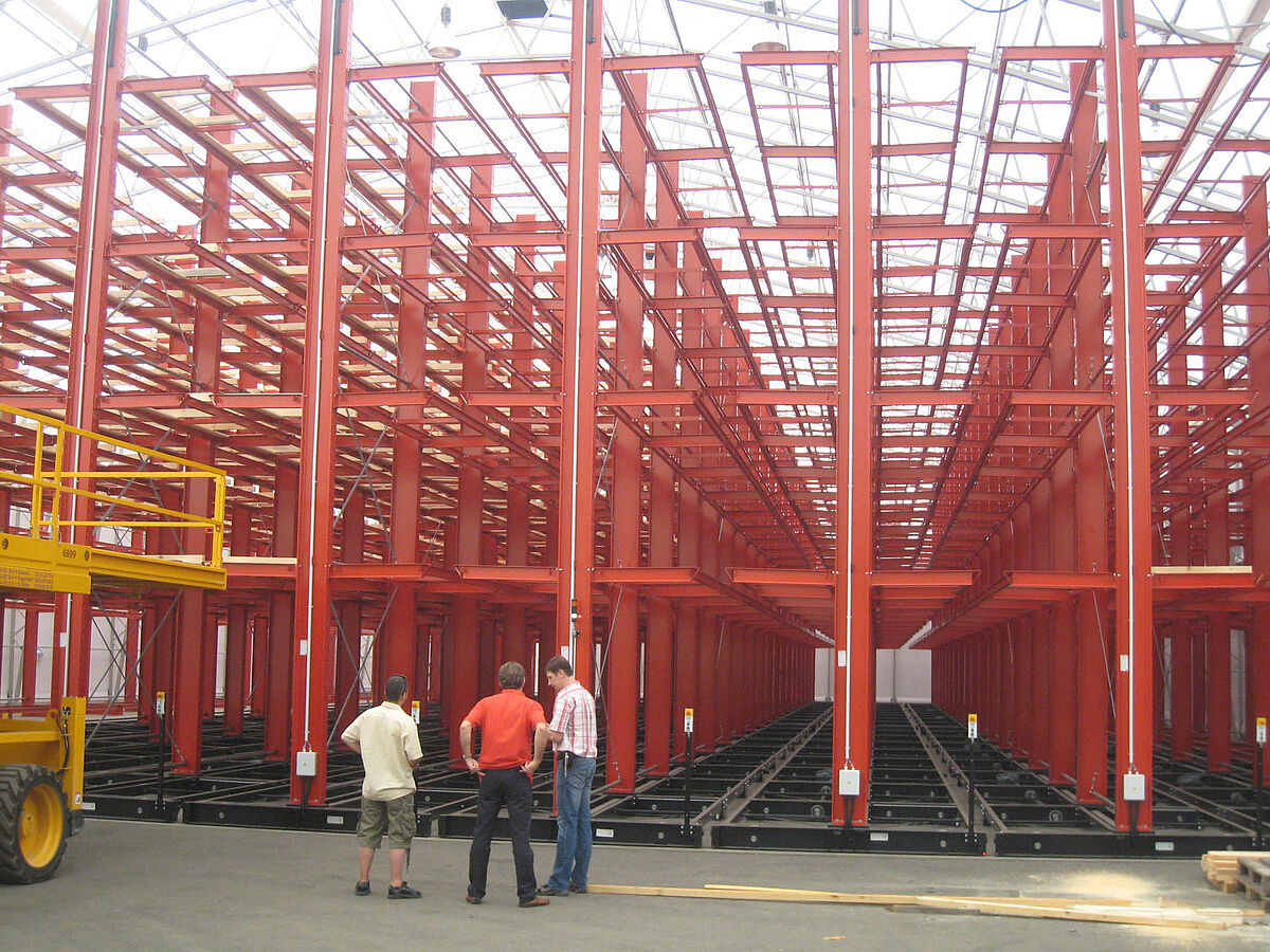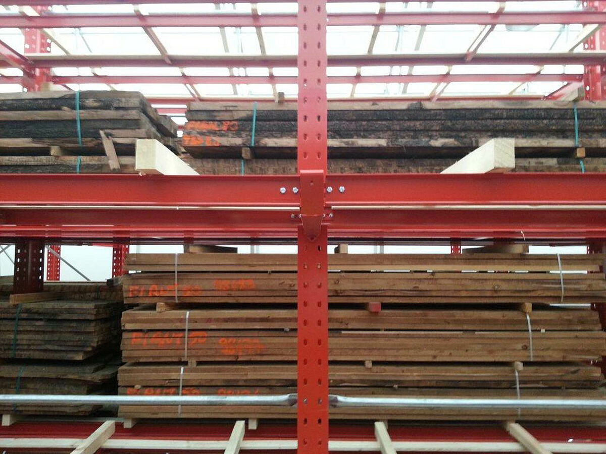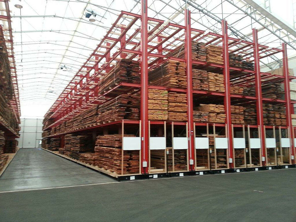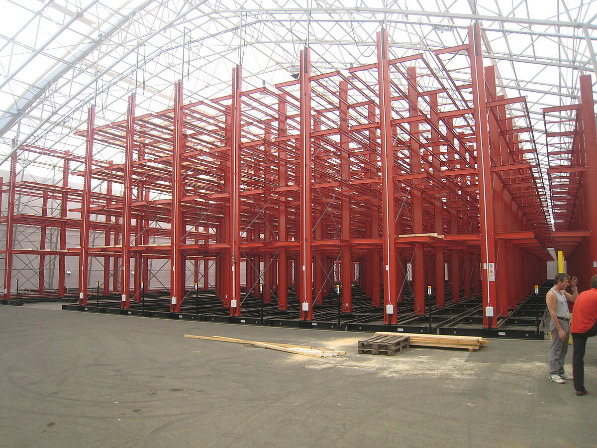 OHRA s'est chargée de l'organisation du système de rayonnages complet. Cela comprenait également l'installation des rails nécessaires aux supports mobiles, qui eut lieu avant la construction du hall extérieur proprement dit. Deux des dix rayonnages à bras portants de 60 m de long, constitués de 4 à 5 niveaux allant jusqu'à 9,2 m de hauteur, ont été fermement vissés au sol. Les huit autres ont été montés par OHRA sur des supports mobiles de 58 m de long. Les supports mobiles sont entraînés électriquement et sont écartés via le système de commande à distance du chariot élévateur. Seule l'allée souhaitée s'ouvre – et la capacité de stockage de la surface existante est pratiquement doublée.