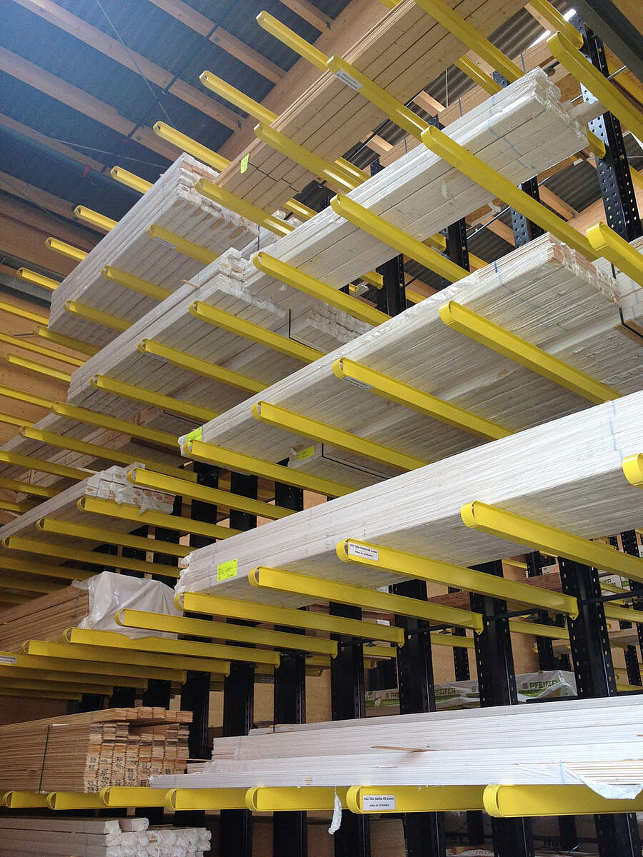 De par leurs dimensions, charges utiles et équipements complémentaires, les rayonnages d'ORHA sont non seulement parfaitement adaptés aux produits vendus par HGC, mais en outre, ont été habillés aux couleurs de l'entreprise : Les poutres et les cadres ont été peints en noir (RAL 9017), les rayons et les bras portants en jaune (RAL 1018). Ainsi, l'identité de l'entreprise de négoce se manifeste de façon indéniable jusqu'à l'intérieur de l'entrepôt où les clients viennent enlever leurs marchandises.