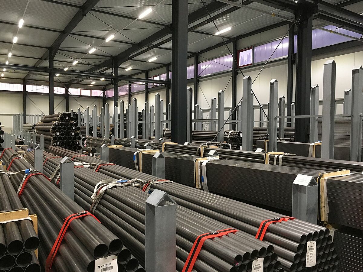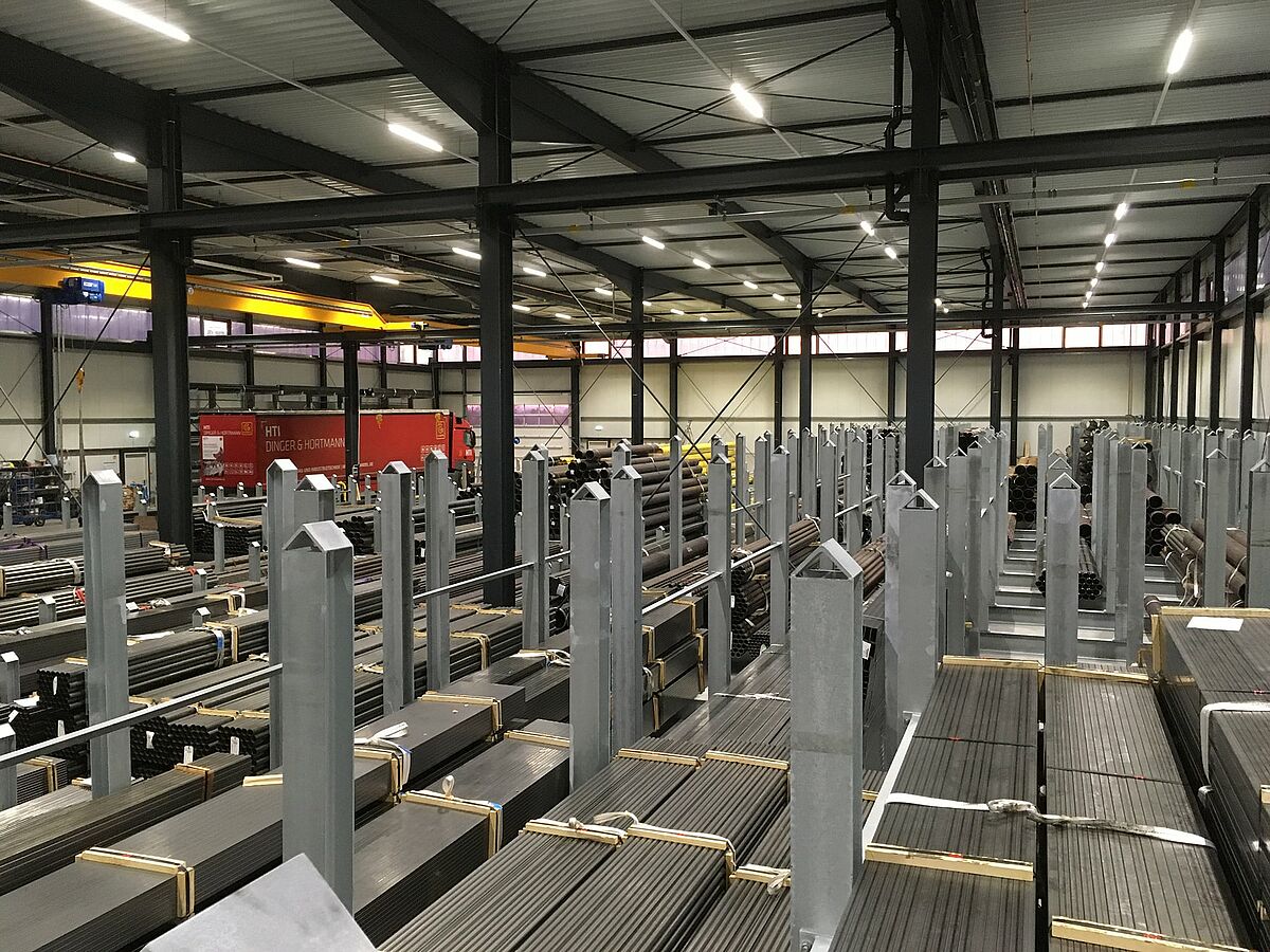 L’entreprise HTI Dinger & Hortmann, grossiste spécialisé dans les matériaux de génies civil et industriel, a amélioré avec efficacité la qualité de ses processus logistiques grâce à son principal entrepôt de tubes nouvellement implanté à Chemnitz. Un nombre conséquent de tubes ou de faisceaux de tubes de différentes longueur et grosseur sont stockés dans les 30 rayonnages à chandelles d’OHRA qui le composent. Ce système de stockage plat permet un chargement et un déchargement ciblés des différents types de tubes à l’aide de quatre grues. Les tubes peuvent également être déchargés directement du camion sur les rayonnages, sans avoir à les tourner, à les incliner ou à utiliser un autre dispositif de manutention. L’accès ciblé aux tubes et la facilité de manipulation permettent un processus logistique particulièrement efficace. En outre, les rayonnages cantilever d’OHRA offrent encore un espace de rangement supplémentaire sur les murs intérieurs et extérieurs de l’entrepôt, lequel est destiné aux tubes plus légers en plastique ou en acier à paroi mince.