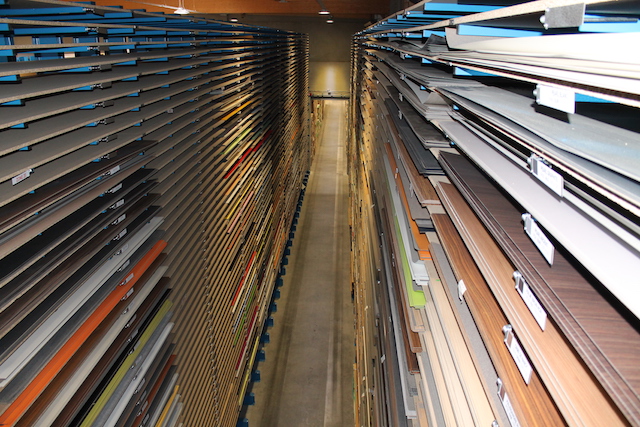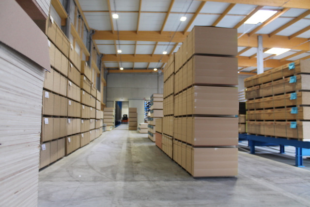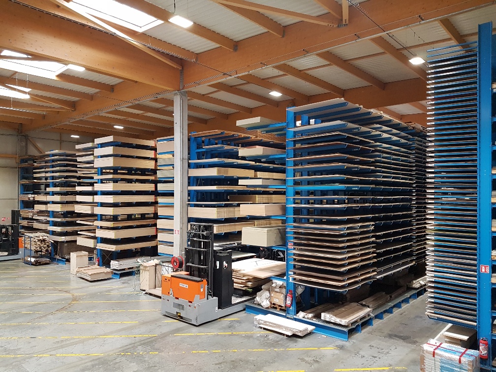 Additionnellement, OHRA a installé une plateforme de stockage sur laquelle sont placés des rayonnages à fond plat, en haut et en bas. Là, des chants thermocollants ou garnitures sont notamment stockés. Cette extension de la surface de stockage d'un niveau supplémentaire permet d'optimiser l'utilisation de l'espace à disposition.