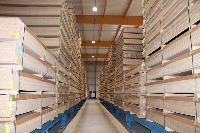 Hue-Socoda, l'un des distributeurs leaders de panneaux de bois de Bretagne, a équipé son entrepôt sur son nouveau site à Langueux avec des systèmes de rayonnage d'OHRA : Grâce aux rayonnages cantilevers robustes, l'installation a pu être réalisée sur une hauteur de neuf mètres et doubler ainsi, la hauteur par rapport à l'ancien entrepôt. Additionnellement, une plateforme de stockage optimise la surface utile dans l'entrepôt : Grâce à elle, il est possible de stocker le petit matériel sur deux niveaux en gagnant de la place. En outre, des consoles de 90 cm de haut simplifient la réception des paquets de panneaux livrés par chariots élévateurs lors de l'arrivage.