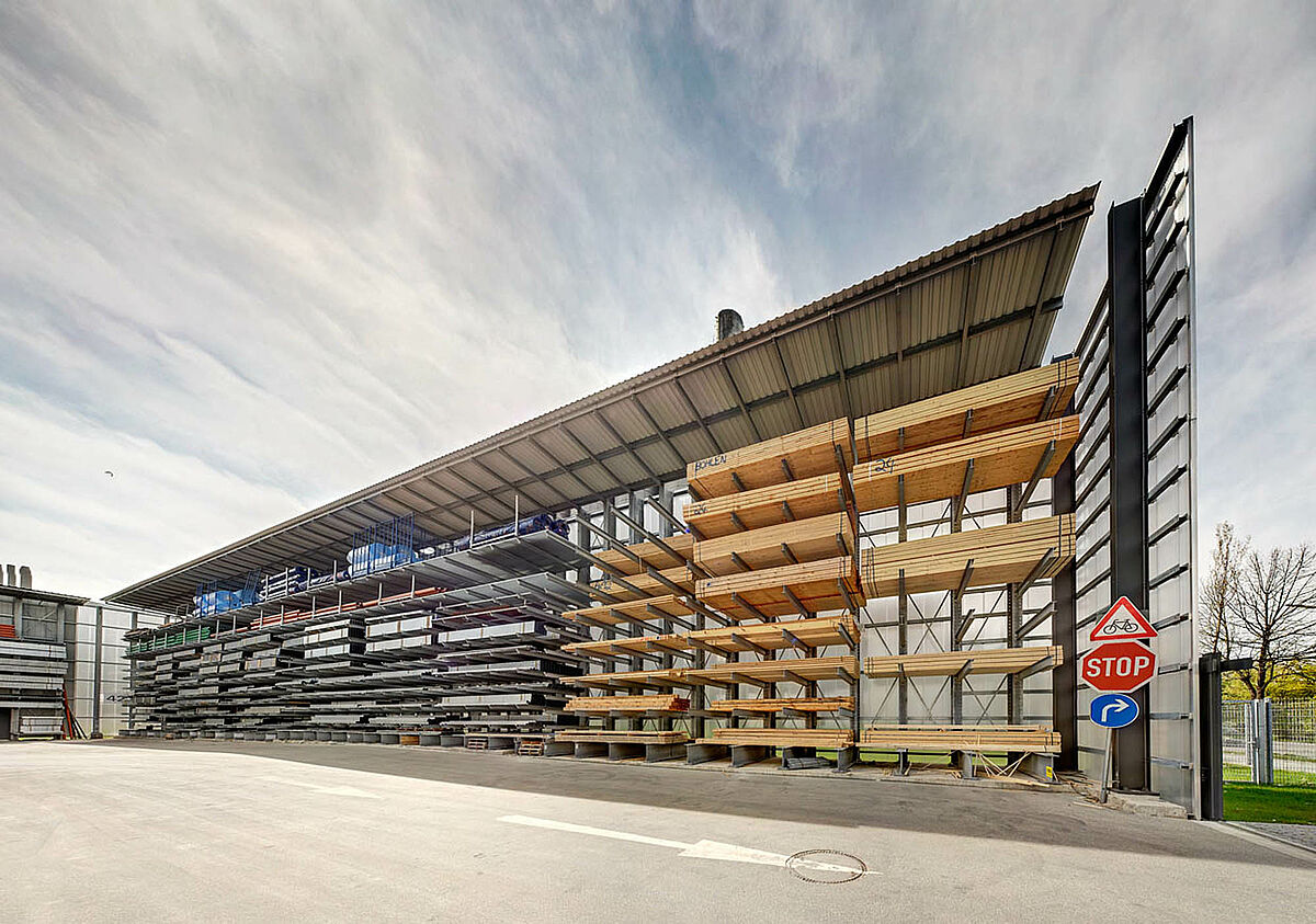 Par exemple des rayonnages cantilevers en finition galvanisée pour l’extérieur. Dans ces rayonnages il est possible de stocker des produits comme des tubes, des dalles de béton ou des chevrons bois. Les rayonnages sont équipés avec une toiture et des caillebotis pour les petites marchandises. Un défi de la réalisation était la pente de la toiture vers le côté qui était nécessaire à cause des particularités du terrain.