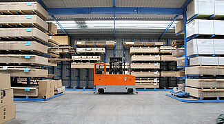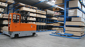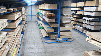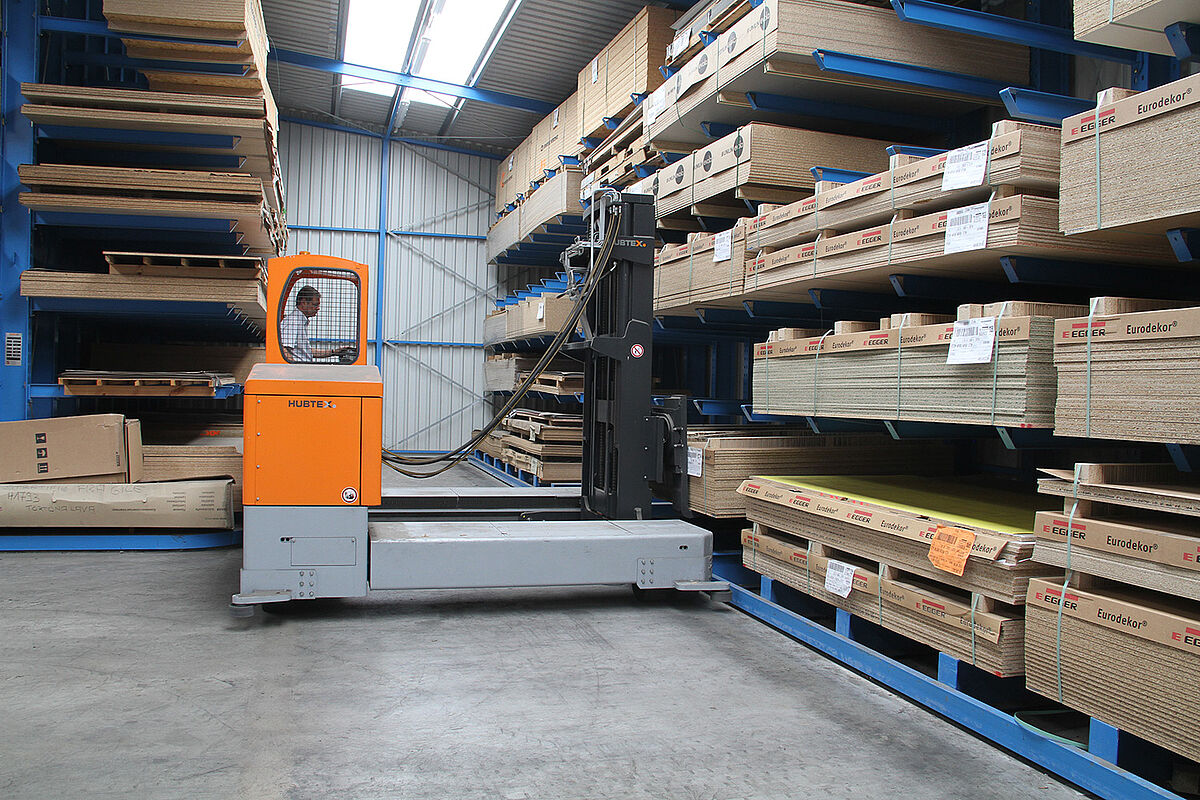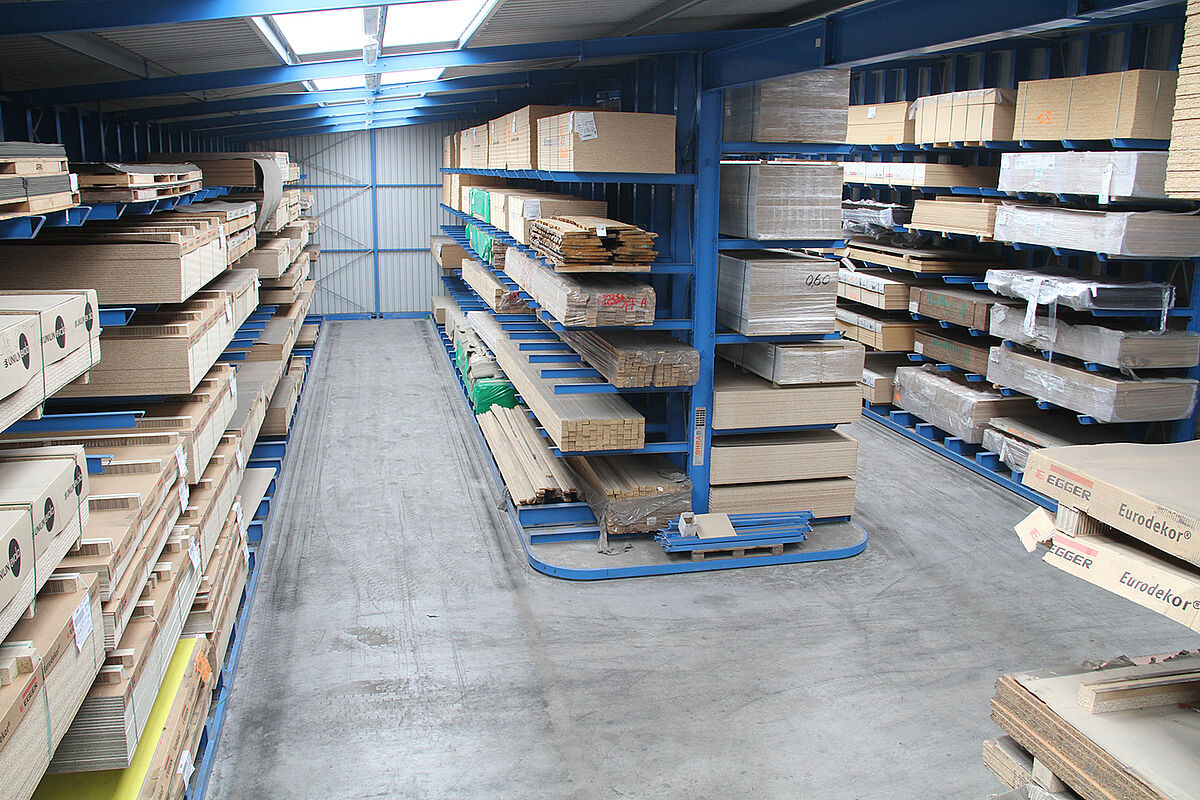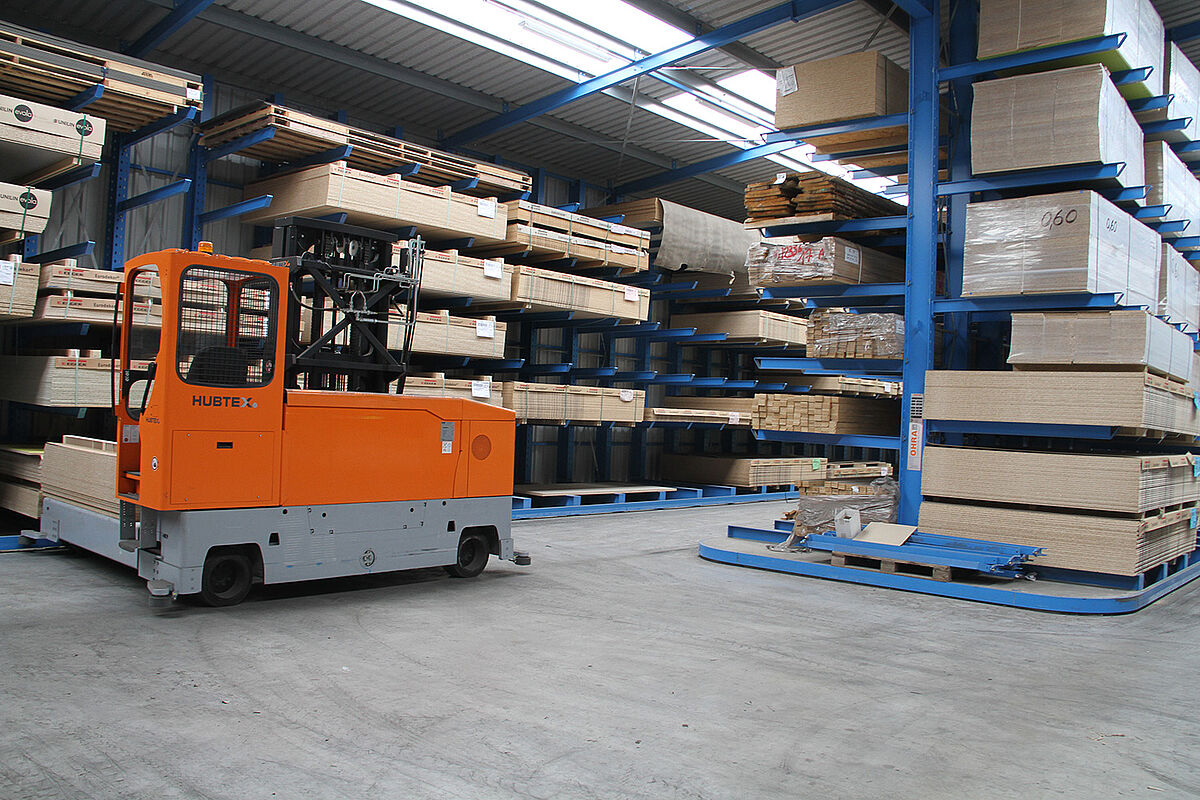 Un hall d'entrée de 38 mètres de long, dont les murs extérieurs sont formés par des rayonnages cantilevers simple-face, ont été construits. De plus, un rayonnage cantilever double-face a été placé entre ces deux rayonnages. Les rails de guidage permettent l'utilisation d'un chariot latéral multidirectionnel dans des allées étroites. Grâce à des rayonnages sur mesure d'une hauteur de 5,5 mètres, 6,3 mètres et 7,1 mètres, le hall a pu être adapté de manière optimale au terrain. Chacun des bras cantilever de 1850 millimètres de long peut supporter une charge de 600 kilogrammes. Les bras ne sont pas boulonnés ni soudés, mais sont fixés accrochés de manière mobile sur les colonnes du rayonnage avec un pas de 100 mm. De cette façon, ils peuvent résister aux chocs de manutention sans dommages.
