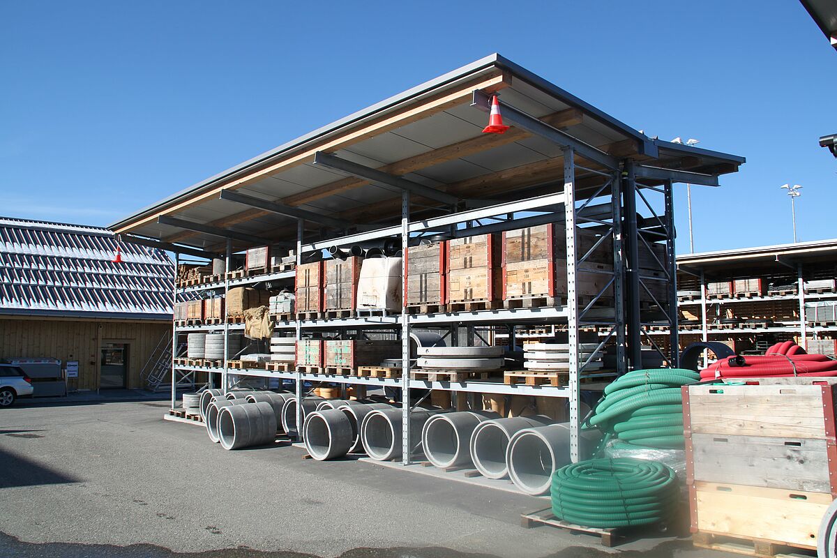 La gamme de produits de la Röhrenhandel Appenzell comprend des articles, non seulement pour le génie civil, mais aussi pour le bâtiment, l’horticulture et les produits généraux en béton. En outre, les artisans trouvent une large offre d’outils et de vêtements de travail. Pour l’entreposage de tous ces différents articles, l’entreprise décida d’installer un mélange de rayonnages à palettes et de rayonnages cantilever, qui sont installés en partie dans un hall et en partie dans la zone extérieure. Le nouvel entrepôt offre de la place pour environ 1.000 Euro palettes manipulées par des chariots élévateurs et des gerbeurs