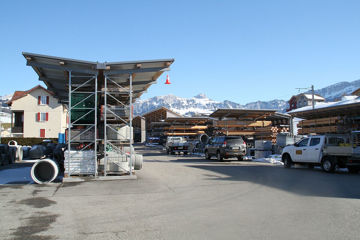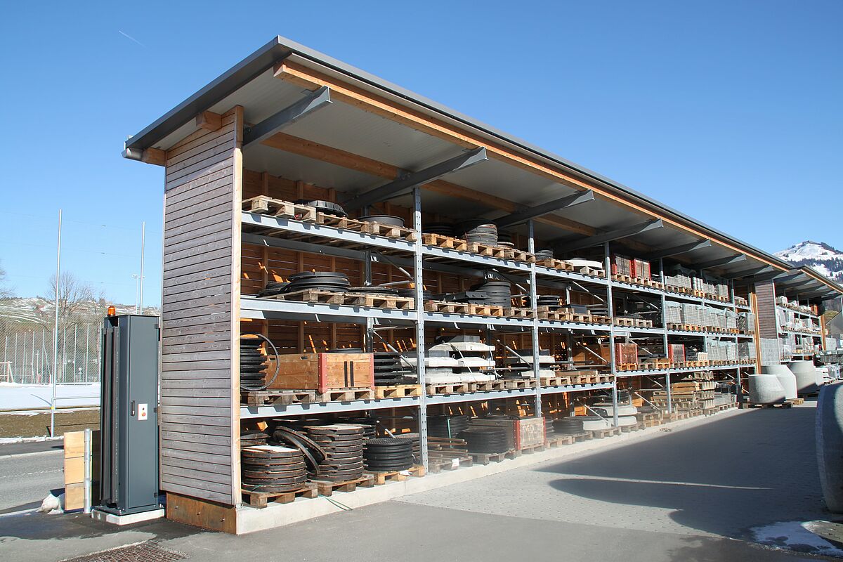 Les rayonnages à palettes et rayonnages cantilever installés dans la zone extérieure sont dotés d’un toit en vue de protéger les marchandises entreposées ; pour cela, OHRA équipa les supports de bras adéquats, la couverture du toit fut effectuée par une entreprise de construction locale. À cet égard, OHRA étudia la statique selon des charges de neige allant jusqu’à 484 kilos par mètre carré auxquelles il faut s’attendre à Appenzell et des charges de vent allant jusqu’à 110 kilos par mètre carré.