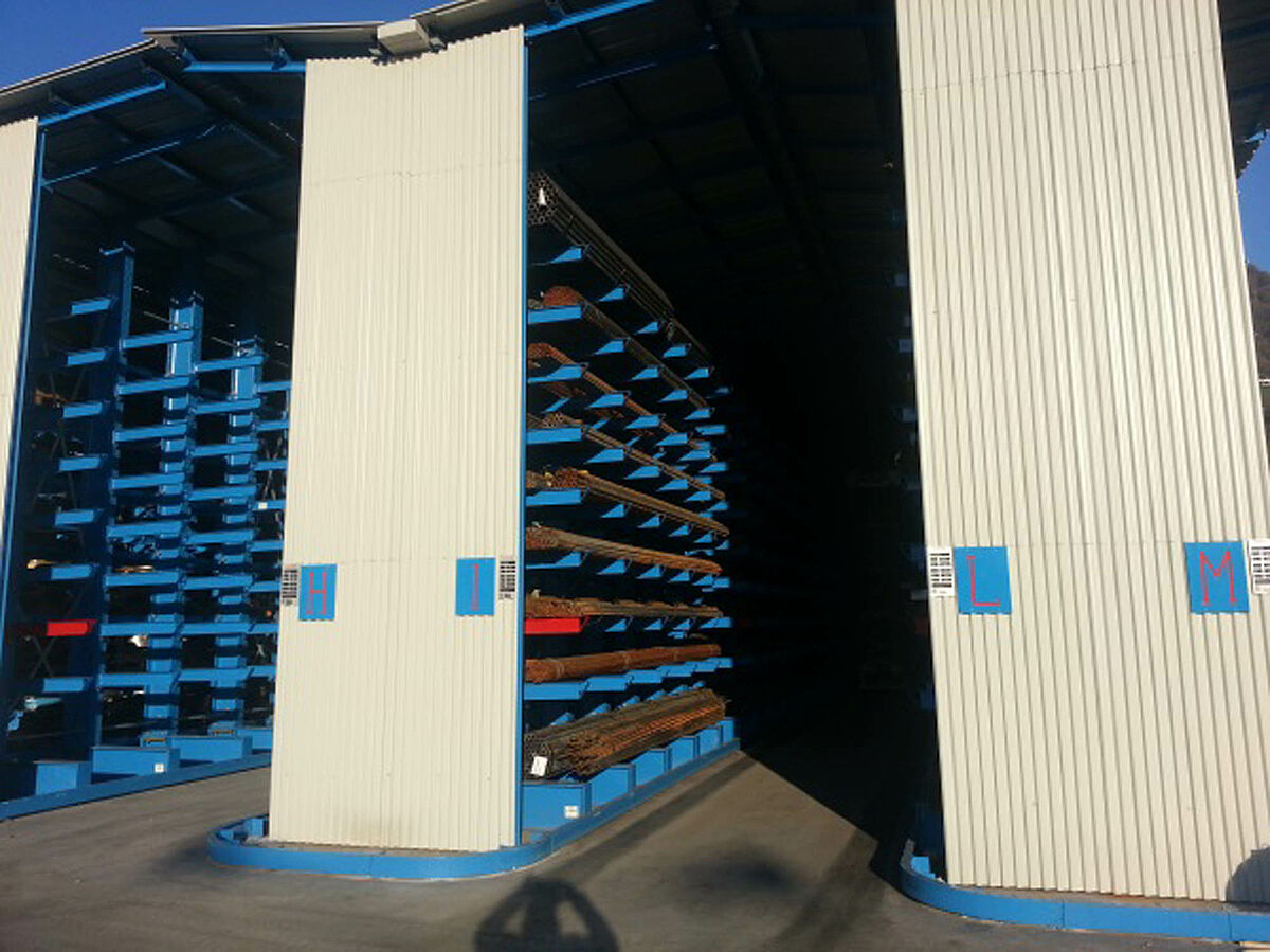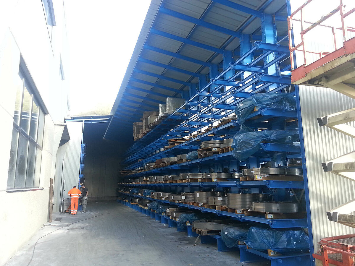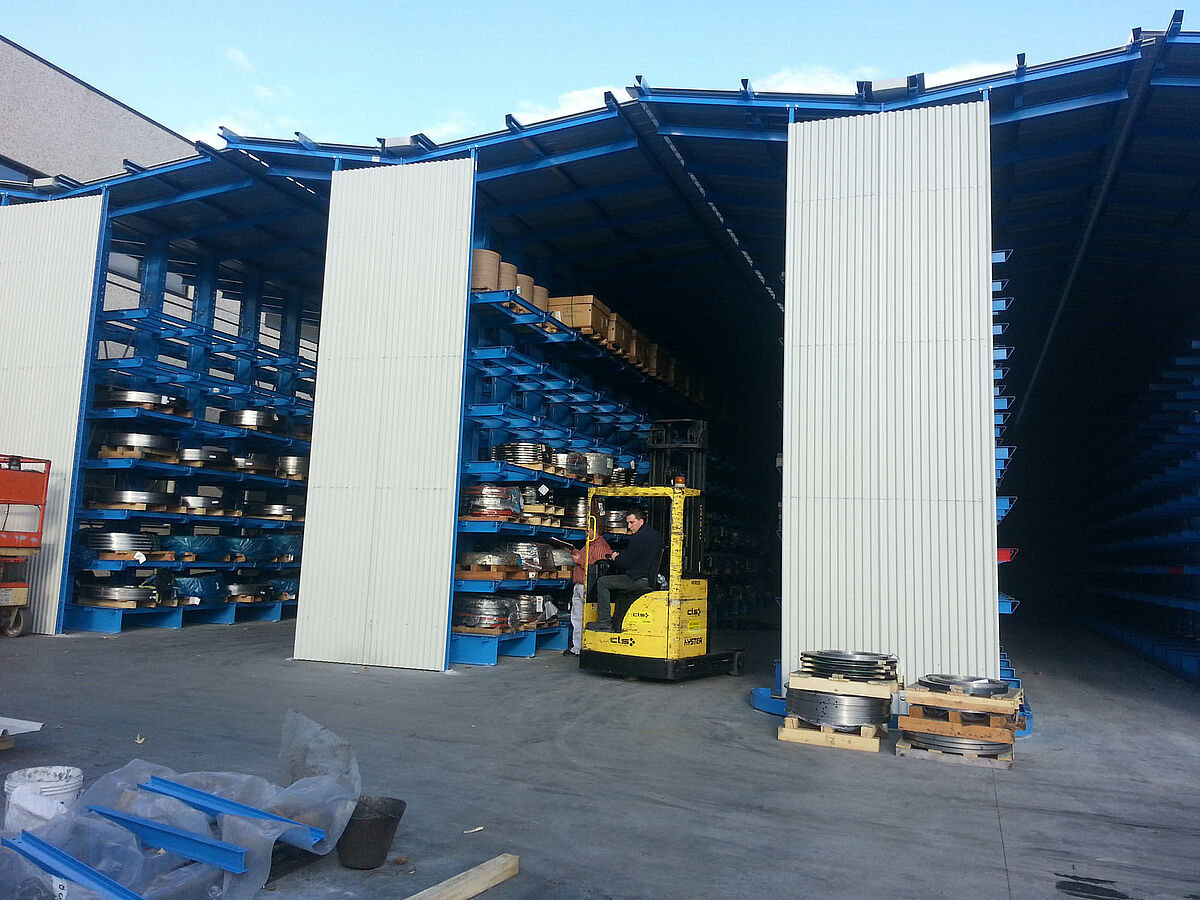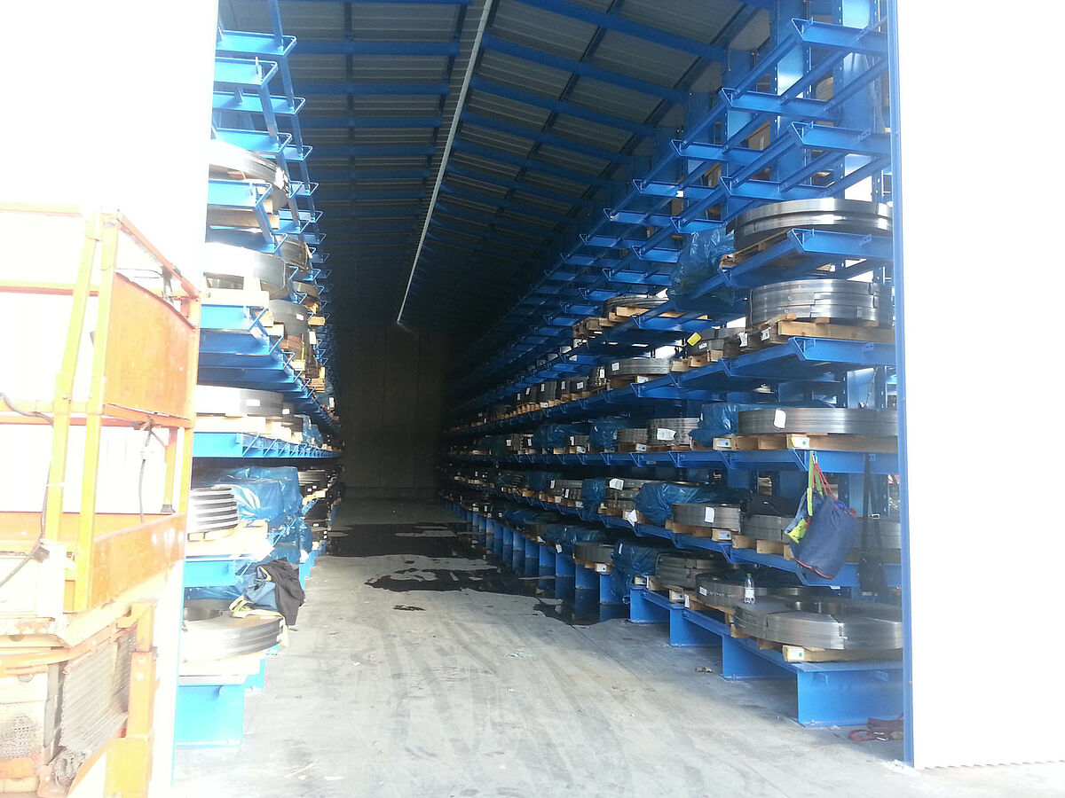 Les trois premières rangées accueillent les barres ligaturées de 6500 millimètres de long et d'un poids de 4000 kilogrammes sur neuf niveaux en double profondeur. Les bras portants des étagères sont accrochés et peuvent être ajustés au millimètre près au moyen de vis - garantissant ainsi un support uniforme de la marchandise entreposée. Ces allées sont desservies par un chariot élévateur à quatre voies qui est guidé sur des rails fixés aux montants. Les autres rangées sont équipées de traverses qui constituent ainsi une surface d'entreposage continue sur sept niveaux. C'est ici que sont emmagasinées les bandes de tôle palettisées d'un poids de 1200 kilogrammes. Ces allées sont desservies par un chariot élévateur.