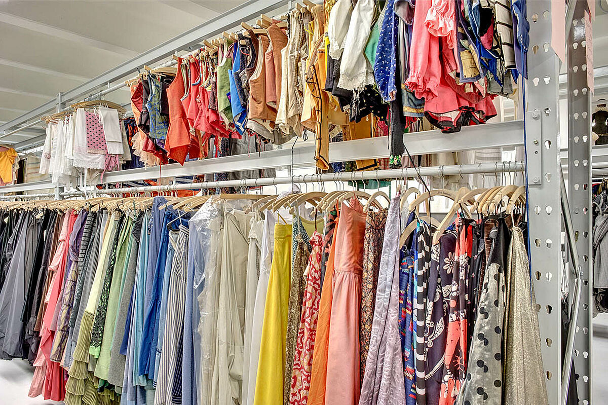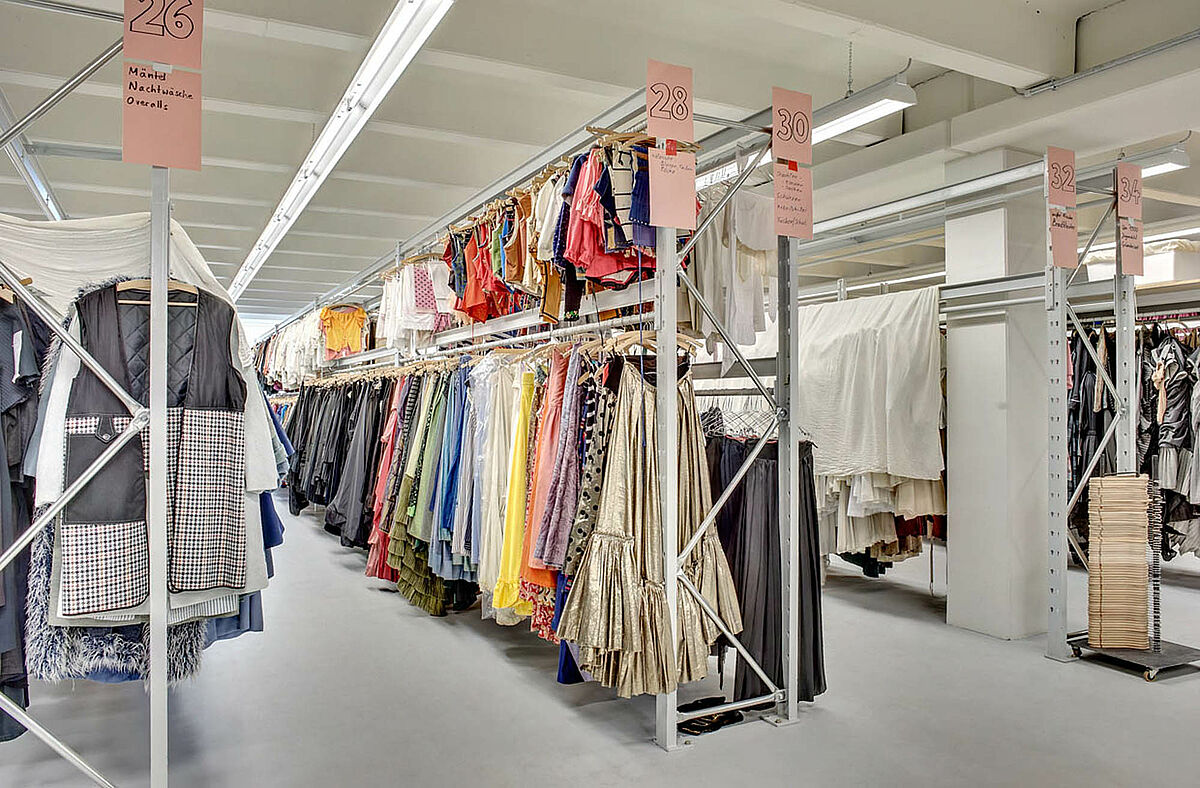 Un autre hall de 3 niveaux est utilisé pour stocké les meubles, des lampes etc. Un étage entier est réservé pour des costumes, chaussures et autres accessoires. Les costumes font une rangée de 2.400 m de long, sans compter les rayonnages pour chaussures, chapeaux etc. !!!