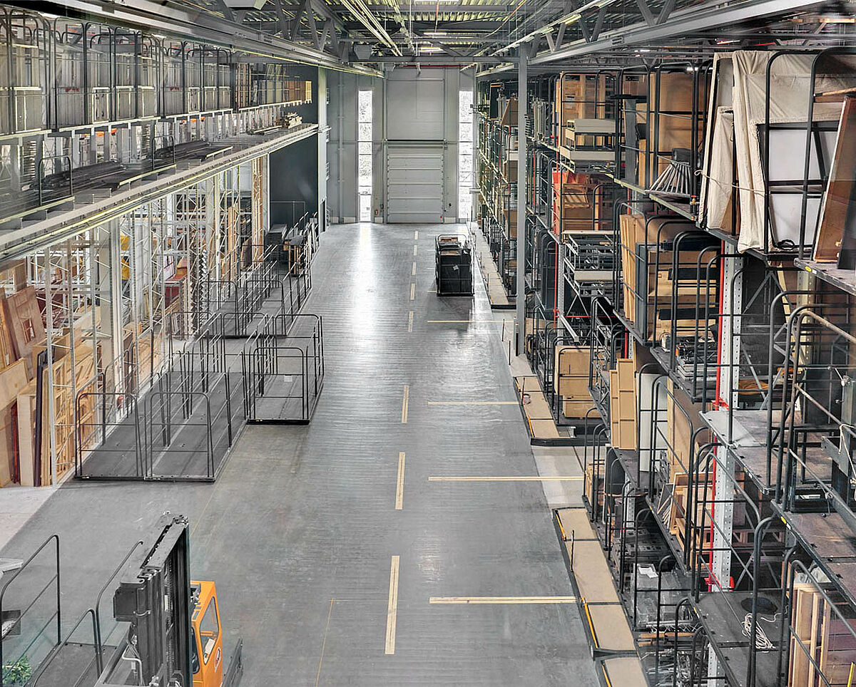Des décors, non stockable sur des chariots, se trouvent debout dans des boxes spéciaux.