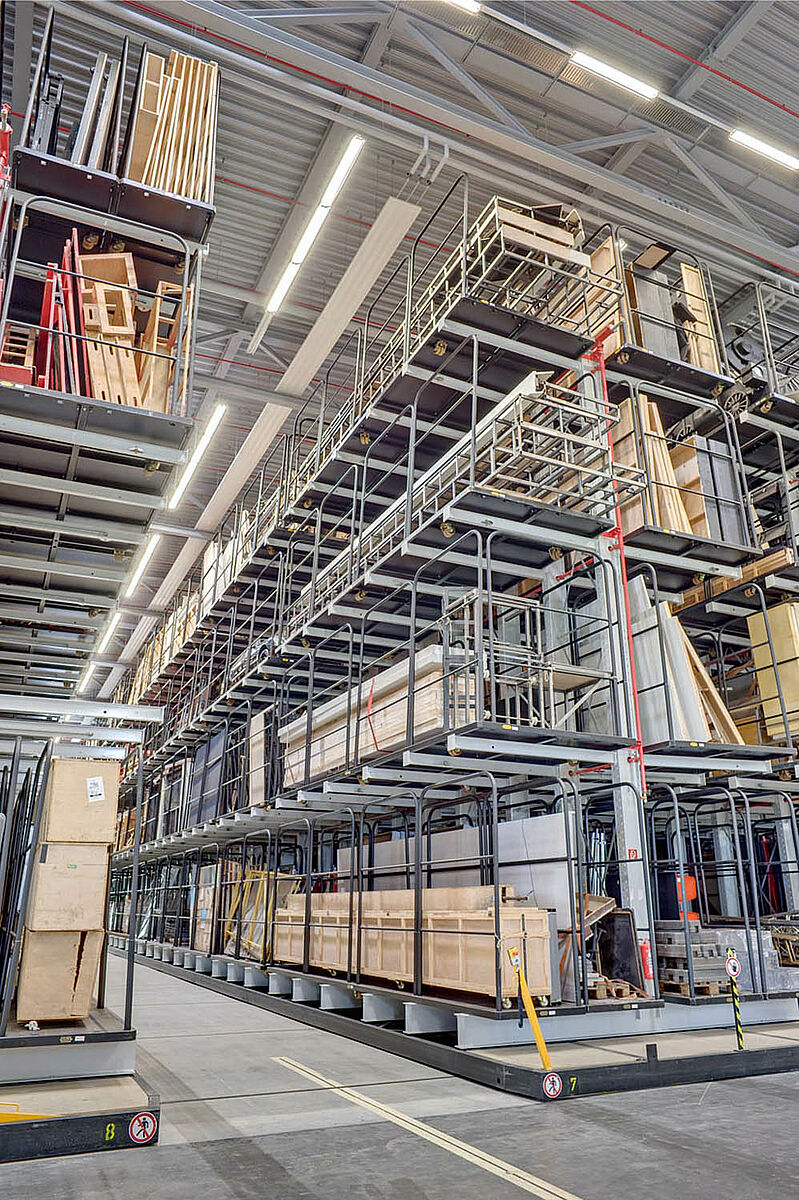 Dans ce nouveau bâtiment se trouve le cœur de l’entrepôt, des énormes rayonnages cantilever sur bases mobiles. Effectivement, les dimensions sont impressionnantes.
