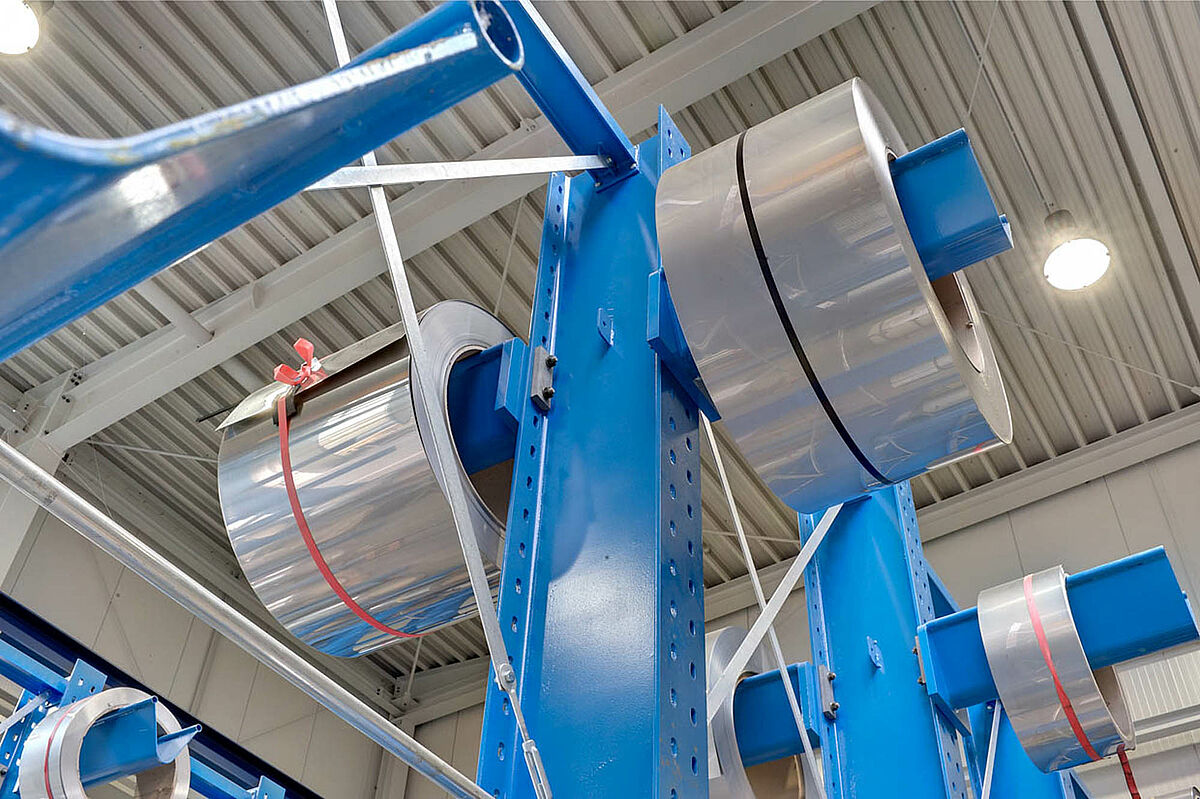 Pour la construction des plaques on utilise des tôles d’acier qui sont stockées, sous forme de bobine, pour la production. Dépendant de leur utilisation, les bobines ont des mesures et des poids différents.