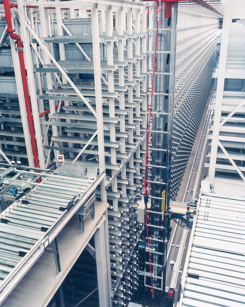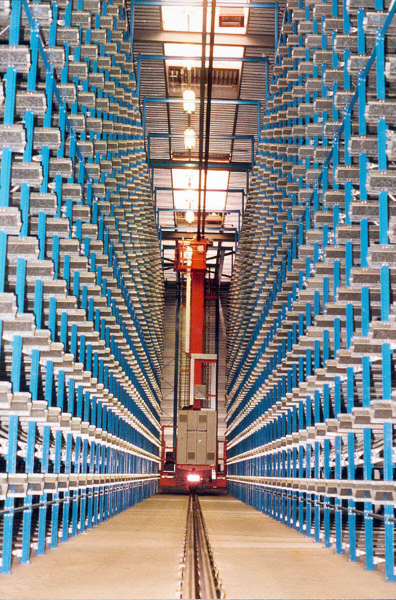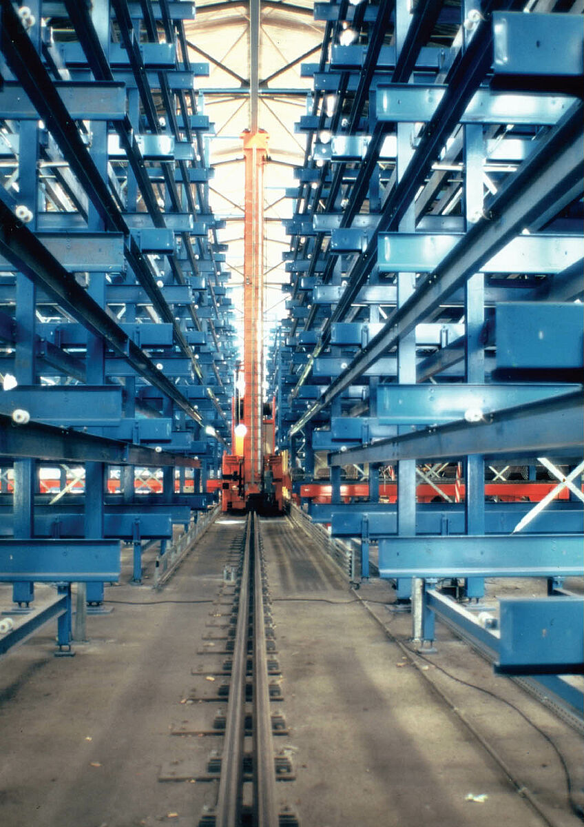 Optimisation de stockage par l'automatisation partielle ou totale des opérations de stockage et de déstockage des marchandises. Selon le principe „la marchandise vient à l'homme“, une plus grande efficacité est enregistrée pour des préparations de commandes optimisées. Un ou plusieurs paquets avec des plaques de tôle de formats différents ou des paquets entiers avec des tubes ou barres peuvent être extraits et véhiculés jusqu'à la station de transfert. La manutention s'effectue avec une grue de plafond ou des transstockeurs (RGB).