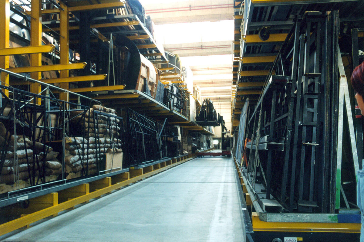 Les rayonnages sont montés sur des chariots robustes et offrant une bonne résistance aux torsions. Seule l’allée de stockage souhaitée peut être ouverte. Contrairement aux rayonnages statiques, cette solution peut améliorer le volume et la capacité de stockage jusqu’ à 85%. Une telle solution a été utilisée aussi par l’Opéra de Zurich et par le théâtre national de Stuttgart. Les rayonnages sont montés sur des chariots robustes qui peuvent être positionner à quelques centimètres l’un de l’autre . Ce faisant, une quantité significative peut être stockée dans une espace confiné. En appuyant sur un bouton, on peut ouvrir exactement le couloir de rayonnage où vous souhaitez stocker les décors des coulisses. Un défi particulier est p.e. la pose des rails ou le sprinklage (monté sur les rayonnages mobiles) et la conception globale de la manutention avec un chariot élévateur électrique multidirectionnel et les supports de marchandises particulières.