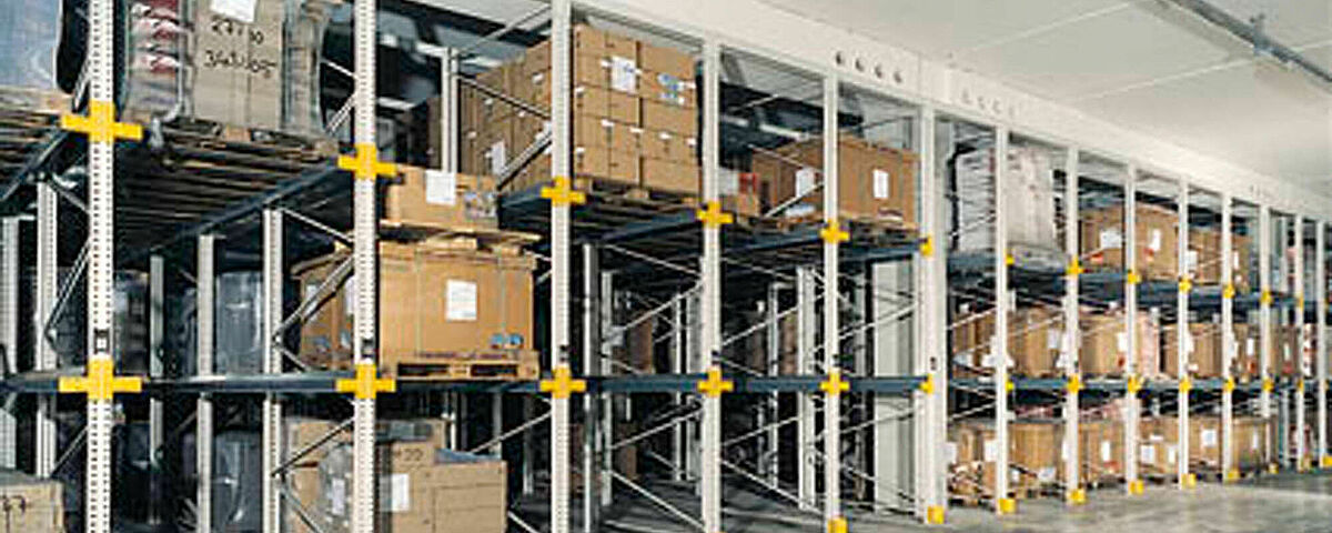 Le rayonnage à accumulation (appelé également « rayonnage drive-in ») allie les avantages du stockage en blocs et en racks : exploitation compacte de l’espace disponible pour une hauteur de stockage identique. Il est particulièrement adapté pour le stockage de grandes quantités d’un même article et des produits non gerbables sensibles à la pression. Parmi ces produits, on trouve les lessives, les catalogues, l’huile moteur, le papier de toilette ou les conserves de longue date limite.