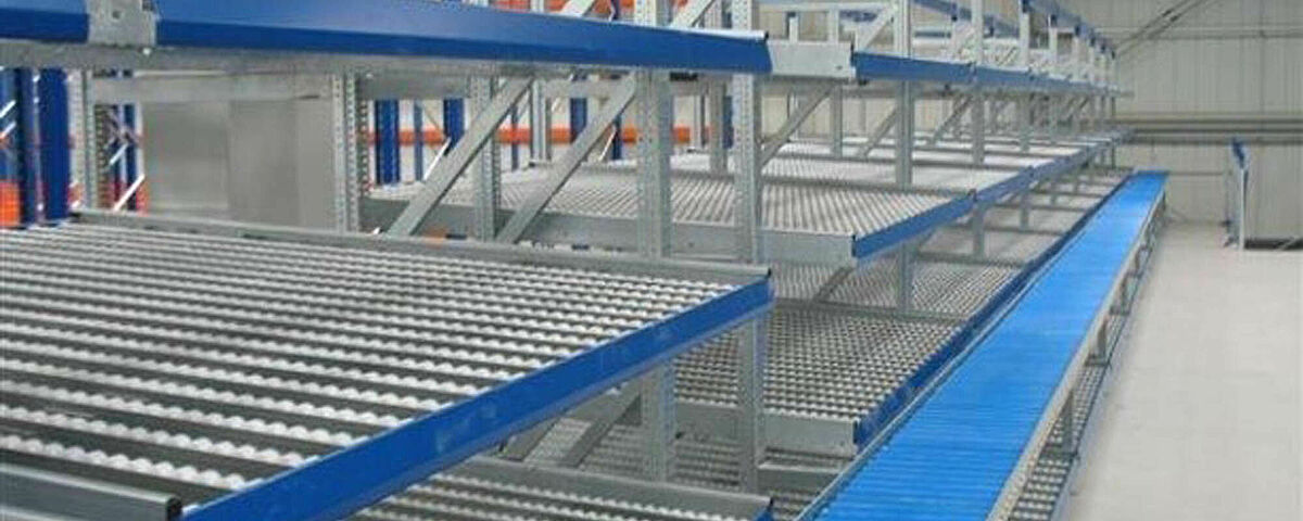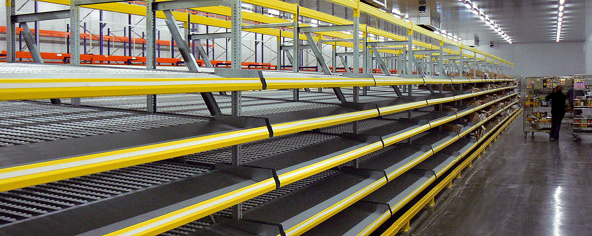 Les rayonnages dynamiques à palettes sont des solutions peu encombrantes, conçues selon le principe du premier entré, premier sorti et permettent une grande utilisation de la surface grâce à la formation de canaux. Les rayonnages dynamiques de préparation des commandes sont particulièrement adaptés aux marchandises en carton ou aux caisses pouvant être transportées sur des convoyeurs à rouleaux et permettent d'optimiser les trajets de travail ainsi que les temps de préparation des commandes selon le principe FIFO. Les rayonnages push-back, également appelés systèmes à trolleys, offrent un stockage peu encombrant selon le principe du dernier entré, premier sorti et permettent de stocker jusqu'à 6 palettes en profondeur sur des trolleys.