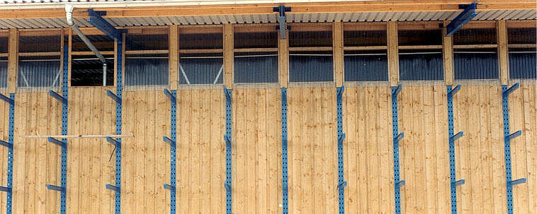 Selon la forme de la toiture, les montants verticaux des cantilevers de ce type de hall sont biseautés dans la partie supérieure et dotés de panneaux ou d’échantignoles. La charpente du hall pour rayonnage cantilever repose sur ces montants. Des tôles bacs acier ou des panneaux anti-bruit ISO ou des systèmes de protection contre les intempéries fixés sur la face arrière du rayonnage permettent de poser le bardage.
