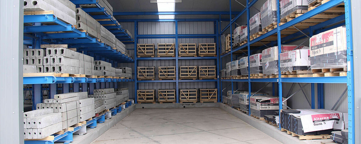 Comme pour les halls pour rayonnages cantilever, les échelles des rayonnages à palettes en profilés en U laminés à chaud supportent la charge de la construction des toits et bardages. Pour réaliser la toiture, les échelles des rayonnages sont biseautées en haut puis fixées aux profilés de toit. Selon les conditions géographiques, les charges locales dues à la neige et à l'action du vent, mais aussi les zones sismiques sur demande, sont prises en compte pour garantir un ancrage optimal dans le sol.